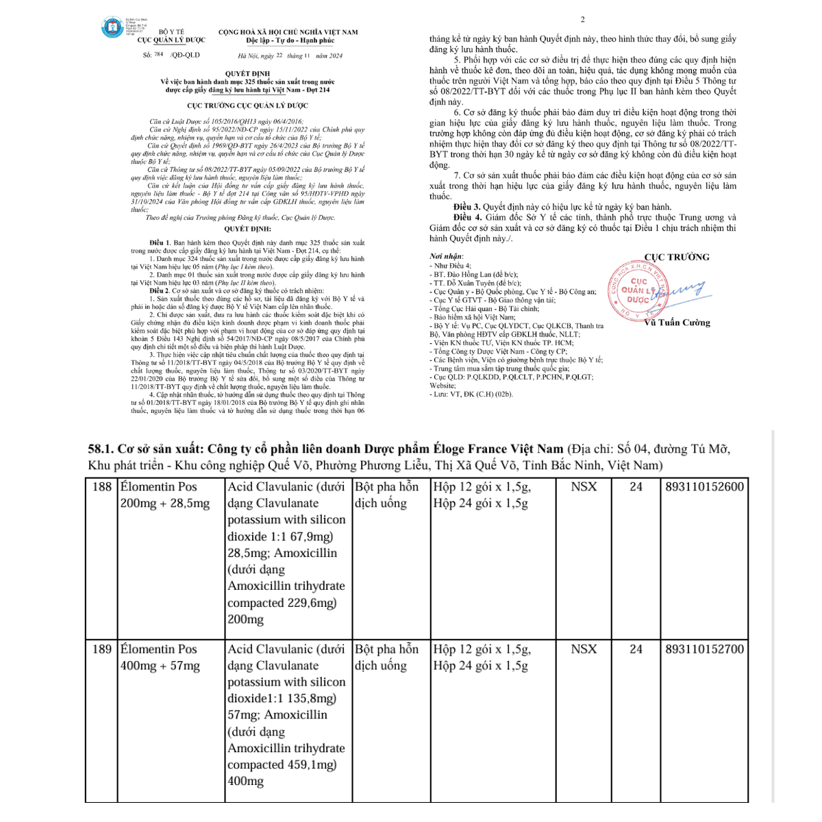 • Acid Clavulanic (dưới dạng hỗn hợp Kali clavulanat và Silicon dioxyd 1:1) .......... 57 mg